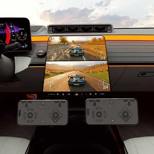 The experience includes thrilling 2-player modes, where the second player can join using a Bluetooth gamepad, or both players can opt for gamepads for added flexibility. Drivers can also play using the vehicle's steering wheel, adding a unique and engaging dimension to the gameplay.
